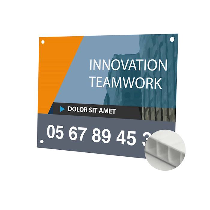 Finitions : Impression recto/verso 1 couleur, 2 couleurs, 3 couleurs ou quadri selon votre choix. Formats classiques 120x80 avec ou sans oeillets. Avantages : Produit ultra économique et léger. Exemples d'applications : Panneaux de chantiers, panneaux d'agences immobilière, panneaux de flèchage. Conseils de "pro" : Pour une meilleure fixation prévoir un oeillet à chaque angle.