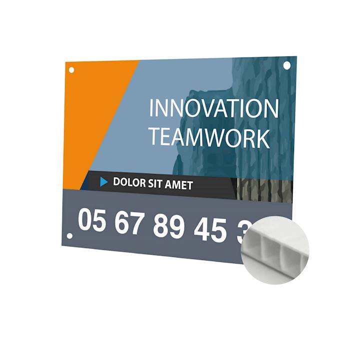 Finitions : Impression recto/verso 1 couleur, 2 couleurs, 3 couleurs ou quadri selon votre choix. Formats classiques 120x80 avec ou sans oeillets. Avantages : Produit ultra économique et léger. Exemples d'applications : Panneaux de chantiers, panneaux d'agences immobilière, panneaux de flèchage. Conseils de "pro" : Pour une meilleure fixation prévoir un oeillet à chaque angle.