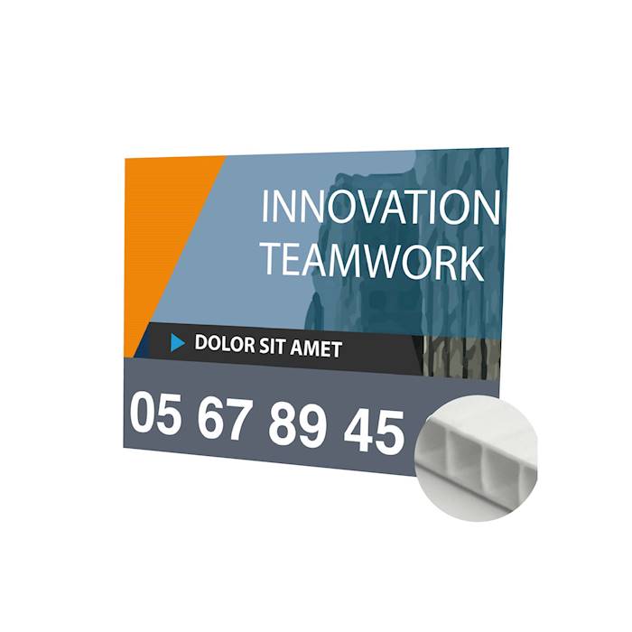 Finitons : Impression UV recto quadri sur panneau Polypro alvéolaire 10mm. Format minimum 40cm x 60cm. Les formats > à 150cm x 200cm sont livrés fractionnés. Avantages : Produit ultra économique et léger. Exemples d'applications : Panneaux de chantiers panneaux d'agence immobilière, panneau de fléchage, signalétique... Conseils de "pro" : Une bonne fixation en extérieur est nécessaire.