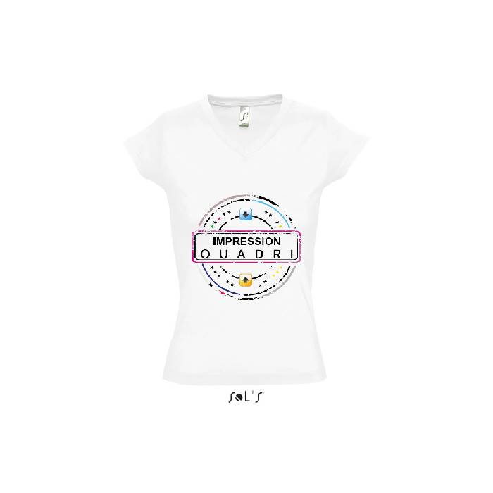 Finitions : Impression numérique quadri sur t-shirt blanc femme Sol's modèle Moon Col V. Avantages : L'impression numérique haute définition permet un rendu de couleur exceptionnel. Exemples d'utilisation : Vêtements de travail, évènementiels ... Conseils de "pro" : Un lavage des t-shirts à l'envers à 30° permet un maintien de la qualité des couleurs sur du long terme.