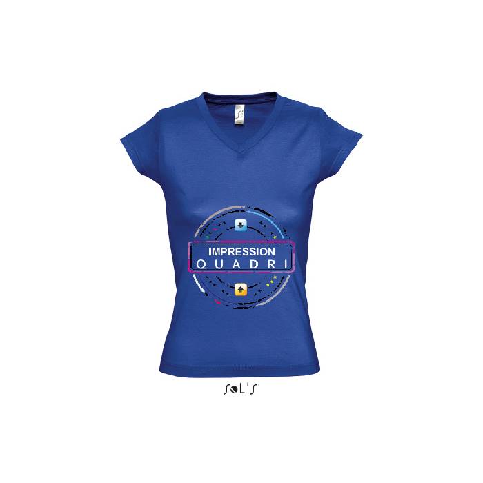 Finitions : Impression numérique quadri sur t-shirt femme Sol's modèle Moon Col V. Couleurs aux choix (voir fiche couleur) panachage couleur possible. Avantages : L'impression numérique haute définition avec blanc de soutien permet un rendu de couleur exceptionnel quel de soit la couleur du t-shirt. Exemples d'utilisation : Vêtements de travail, évènementiels ... Conseils de "pro" : Un lavage des t-shirts à l'envers à 30° permet un maintien de la qualité des couleurs sur du long terme.